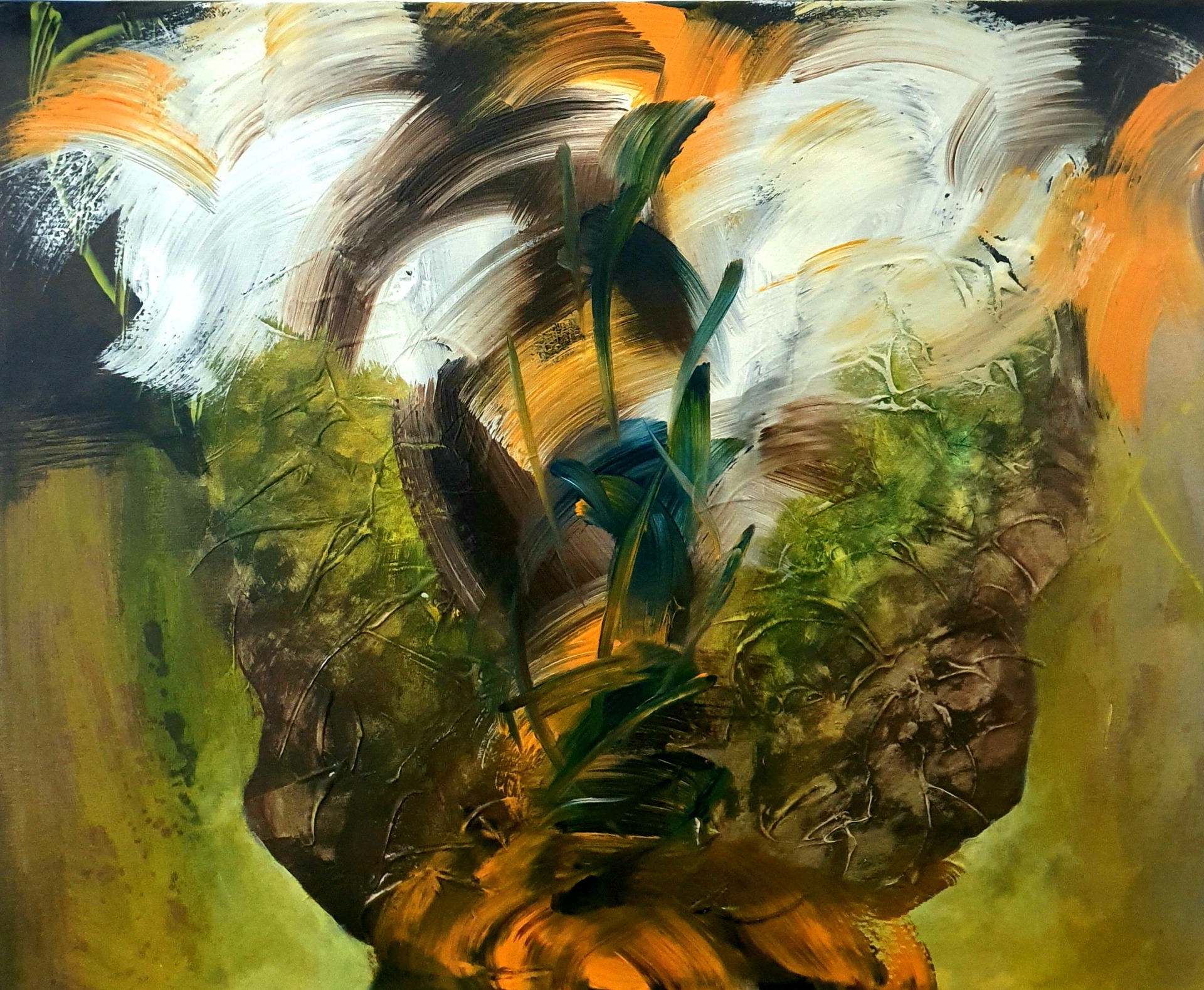 Tento obraz vznikol úplne spontánne, bez rozmýšľania, čo má byť výsledok. Farba ma sama viedla - biela, zelená, oranžová, všetko sa začalo spájať.