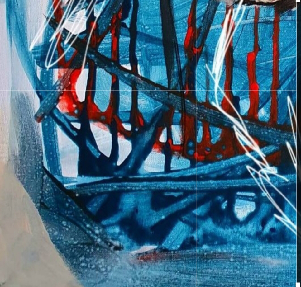 Obraz zachytáva tvár ženy zasadenú do výrazne modrého abstraktného prostredia. Červený kruh pri ústach poukazuje na silu slova a jeho vplyv na naše životy. Slovo má svoju váhu aj dosah. Každý výrok dokáže niekoho posunúť alebo zastaviť.